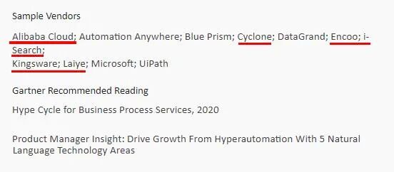 当然,Gartner每年推荐的厂商名单,也是《Hype cycle》报告的重要看点。面向中国市场,《Hype Cycle for ICT in China, 2021》推荐了全球11家RPA技术服务厂商,其中阿里云RPA、弘玑cyclone、云科技扩、艺赛旗、来也科技5家国产RPA厂商等都在被推荐行列。