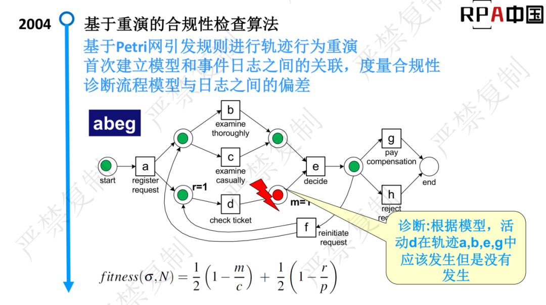 前面提到的Alpha和Heuristic 都是从日志到模型,属于流程挖掘的第一个范畴——模型挖掘。2004年提出的托肯重演是流程挖掘的第二个范畴——合规性检查,目标是建立模型和事件日志之间的关联。具体而言,该方法基于Petri网引发规则进行轨迹行为重演,发现重演过程中模型与日志的偏差。