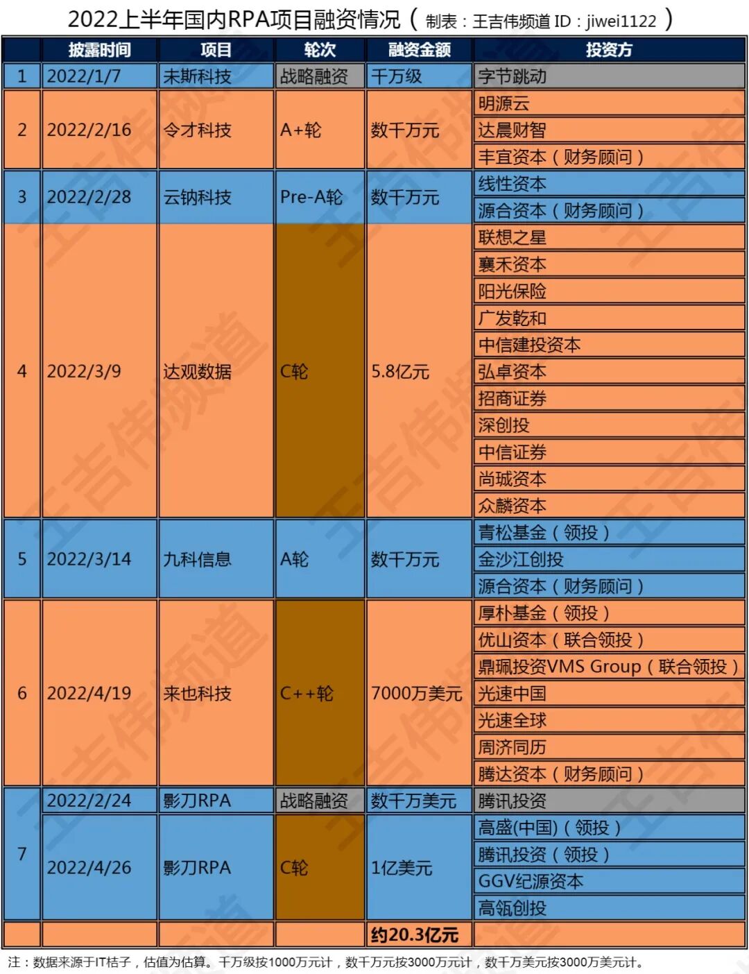 虽然国内只有7起RPA融资事件,融资金额也不算低,融资总额约为20.3亿元人民币。
