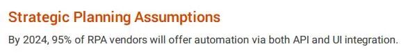 Gartner预测,到2024年95%的RPA供应商将通过API与UI集成为客户提供自动化。这意味着,所有RPA厂商会在2年内完成自身平台的API与UI集成的部署工作。