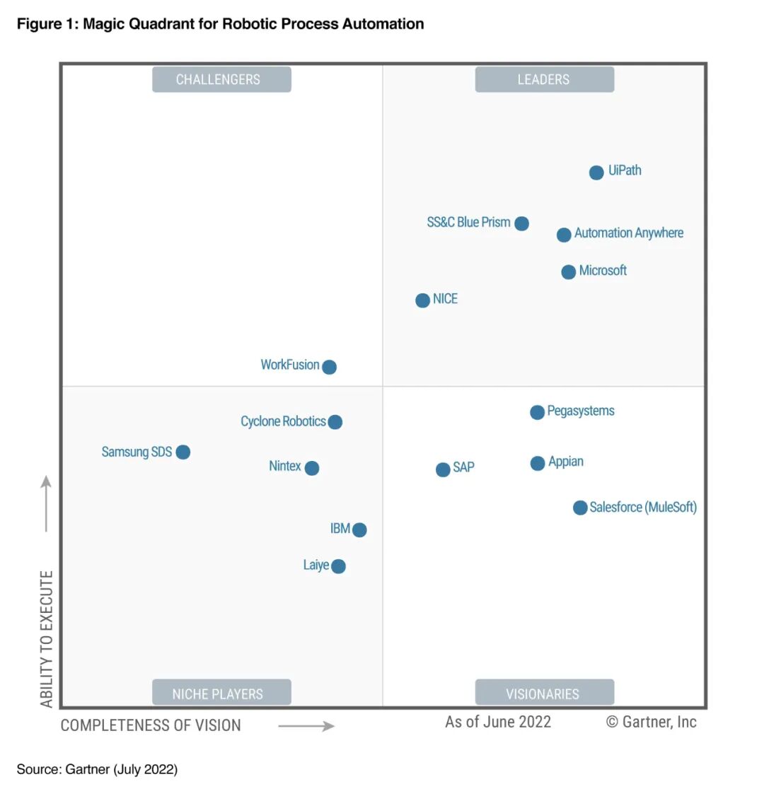 重要的是,这种集成让RPA在业务流程中的稳定性与执行效率大大增强,使得产品能力也大大提升。在MQ报告中,UiPath在Y轴产品能力上遥遥领先。