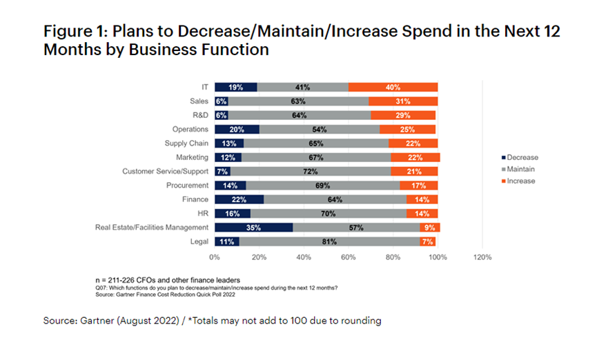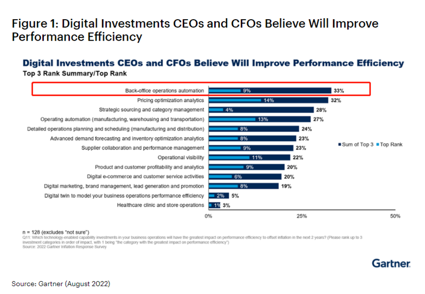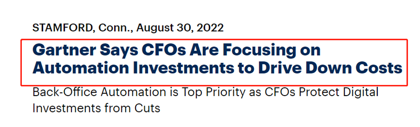 8月30日,Gartner在官网公布了一项调查,首席财务官们计划在削减其他业务成本时,以保护数字技术的投资。在优先技术事项中,首席财务官们特别优先考虑了后台自动化,这是面对持续通货膨胀的情况下降低成本的关键所在,成为重中之重。