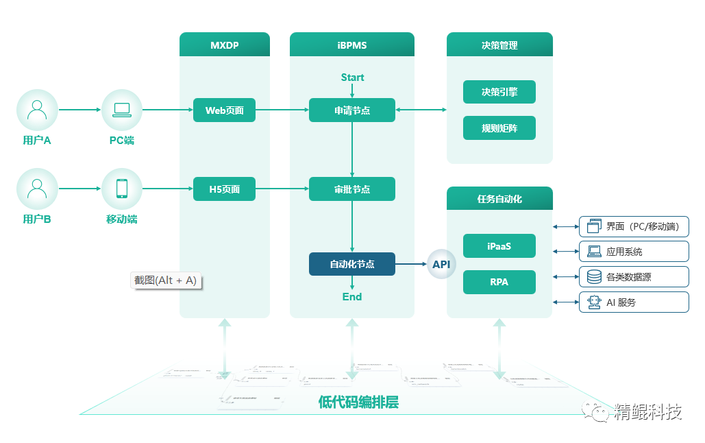 节点1与节点2分别由两个用户进行协作,一位用户通过PC端来访问,一位用户通过移动端的H5页面进行访问,一个流程多端的交互体验由MXDP进行编排加速交付,用户A通过节点1完成申请表单的填写,流程流转到节点2的审批节点,该审批节点既可以让用户B进行主观审批,也可以基于审批决策的规则用DMS完成自动审批(有些iBPMS产品会把部分DMS能力集成在一起),当流程审批完成后,流程流转到节点3的自动化节点,该节点可以通过标准API协议(如Webservice、RESTful等)与第三方系统进行交互,这里自动化节点与任务自动化编排后的工作流所生成的API进行交互,任务自动化通过iPaaS和RPA与PC、移动端、应用系统、数据、AI服务等进行交互调用操作,当任务自动化完后会把执行结果节点3的自动化节点,即业务流程自动化的主流程执行完成。同时 iBPMS的流程编排、任务自动化的执行任务编排、MXDP多端交互体验进行页面编排都应用LCAP的技术理念(与其说LCAP是一种独立的产品,我更想讲LCAP是一个产品设计理念,应用了LCAP设计理念的产品都可以称之为LCAP类的产品,但该类产品可以横跨多个领域),可以让用户使用图形化拖拉拽的方式快速进行编排配置。