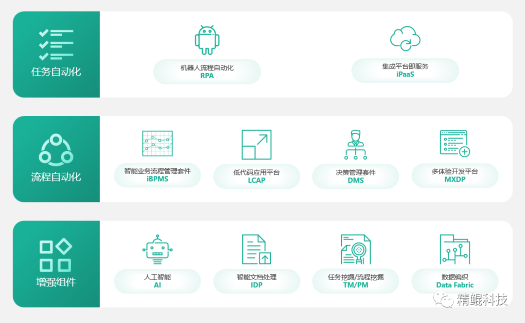 从上图可以看出以单职能视角完成的事项为任务级,而跨多个职能协作完成的一连串任务为流程级。任务自动化是自动运行某个任务的引擎,而流程自动化可以使得复杂工作流程变成自动化。基于此,支撑任务自动化的技术与工具为:机器人流程自动化和集成平台服务,支撑流程自动化的技术与工具会在任务自动化的基础上再增加:智能业务流程管理套件、低代码工具、决策管理套件、多体验开发平台等。