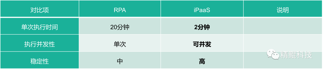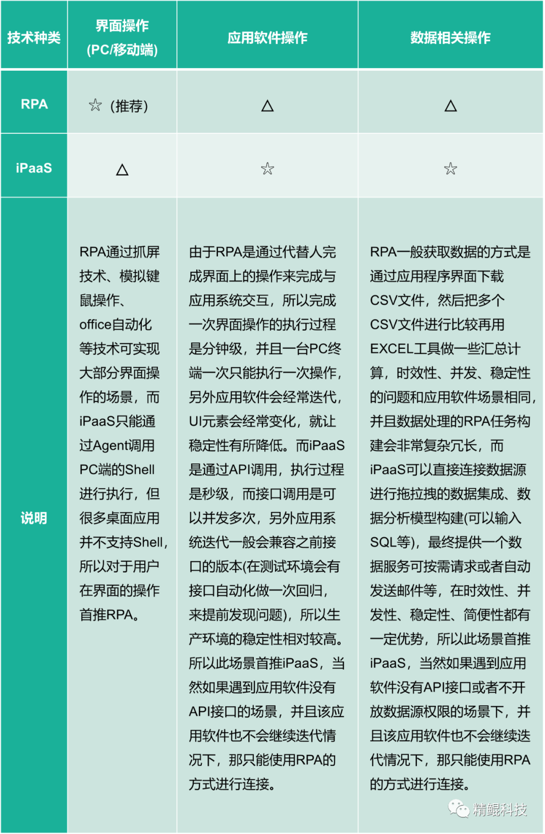 综上所示,任务自动化的技术选择方法:界面操作场景、被操作的应用系统无API接口时和数据权限时首选RPA,其他默认选择iPaaS。