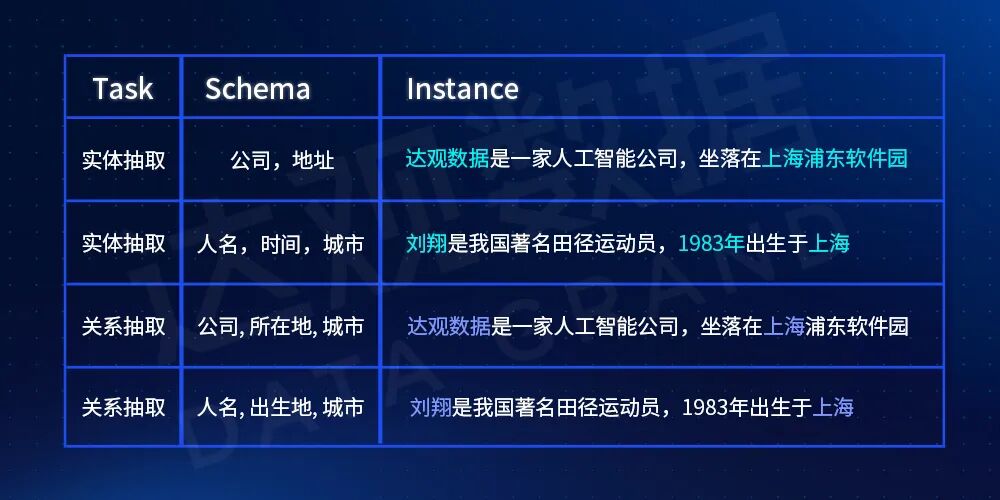 在算法设计上,除之前基于联合标注的序列标注抽取实体关系的工作外,达观也尝试使用统一信息抽取(UIE)框架。因为达观IDPS平台除实体抽取任务外,还支持关系抽取、元素抽取等任务,不同任务类型的网络结构差异导致数据和预训练模型复用受限造成资源浪费,系统也更复杂。通过设置不同抽取类型的Schema,利用UIE端到端生成结构化结果的思想,可以完成单模型多任务的抽取效果。