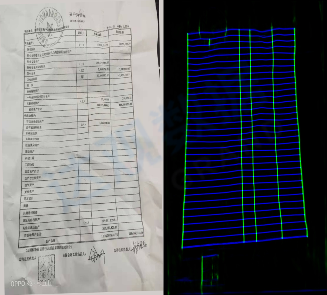 通过使用基于深度学习的算法,能够较好解决传统算法对于图像质量要求高的问题,下面两图展示了利用分割的思想识别表格线的效果,可以看到虽然原图质量不佳,要么线条特别模糊要么整体扭曲透视较为严重,但整体解析效果较好。