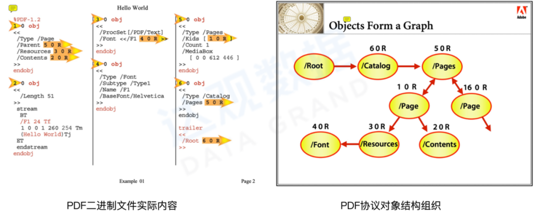 常见的文档格式包括Word、PDF(Portable Document Format)、OFD(Open Fixed-layout Document)等,大部分文件协议的设计都以对象树为主要结构。以PDF协议为例,下图展示PDF文件的实际内容以及文档元素对象的组织结构: