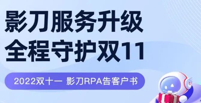 10月30日,影刀RPA又发布了《2022双十一影刀RPA告客户书》,宣布正式启动「影刀服务升级·全程守护双11」双十一大促专项服务保障计划。承诺从10月30日到11月12日,为客户提供大促全节点的实时服务保障。