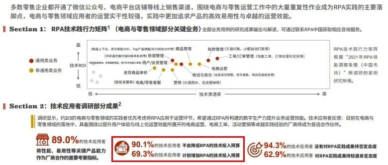 这组数据,可以看到RPA在已采用组织中的受欢迎度,也能看出RPA正在逐渐成为电商运营流程自动化环节的标配。