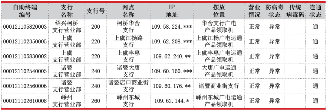 为此,绍兴分行利用RAP技术结合动态链接库ICMP.DLL技术设计了自助设备防病毒自动检查工具。该工具能对ATM、自助终端、回单机、排队机等自助设备的防病毒软件状态、病毒码是否过期等情况进行自动检查,并把有问题设备的终端号、所属支行名称、支行号、网点名称、IP地址、摆放位置、营业情况、防病毒状态、传统病毒码、连通状态等信息自动生成Excel表格(见表2),以便通知自助设备维修商及时处理。自助设备防病毒自动检查工具的应用弥补了常规检查方法难以及时发现自助设备防病毒故障的缺陷,确保了自助设备防病毒软件的正常运行。