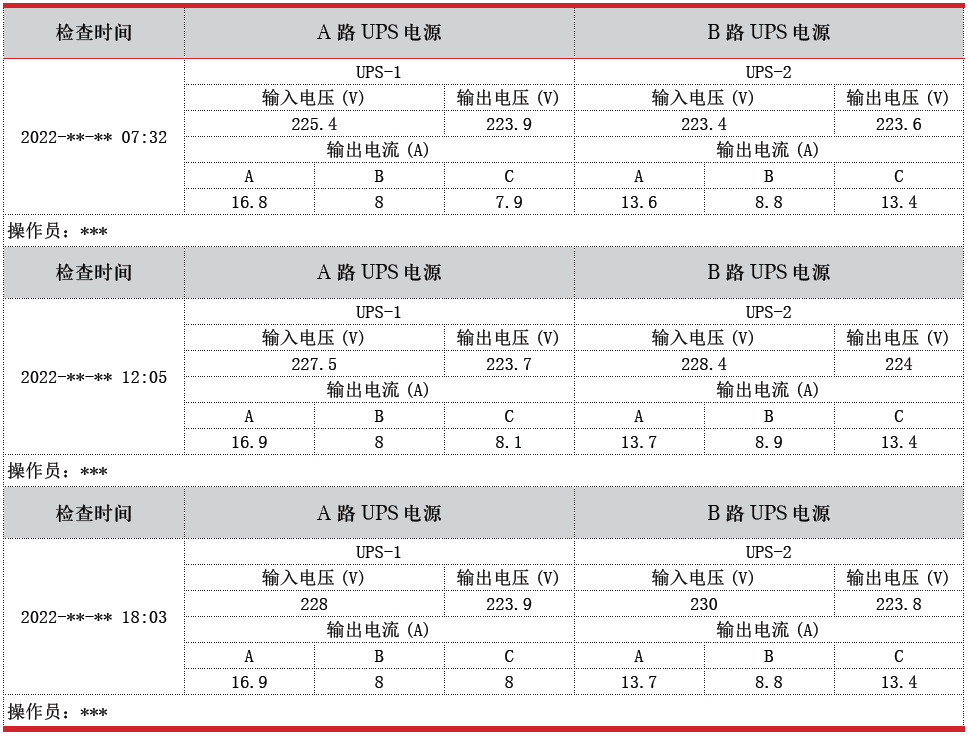 分行主机房的巡检是分行科技管理中一项十分重要的工作,通过巡检可以及时发现生产设备的故障或故障隐患,对保障安全生产运行起着至关重要的作用。为了使分行主机房巡检更加规范,减少巡检中的遗漏,绍兴分行建立了机房条形码扫描巡检的管理模式。在机房巡检中,需要边巡检边记录输入和输出的电压、电流负载等大量数据,很容易出现错误,为此,绍兴分行利用RPA技术实现了条形码巡检服务器与机房监控模块的实时对接。当扫描枪扫描巡检位置的条形码时即自动触发对机房监控模块的监控数据进行实时自动采集,并写入巡检数据库,自动生成UPS设备运行记录表(见表1),实现在巡检时实时自动记录输入电压、输入电流、输出电压、输出电流、旁路电流、输出功率、输出负载等大量数据,避免了巡检数据的错记、漏记,确保了巡检数据准确无误。