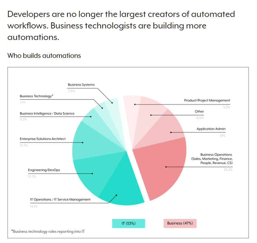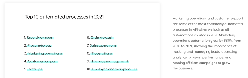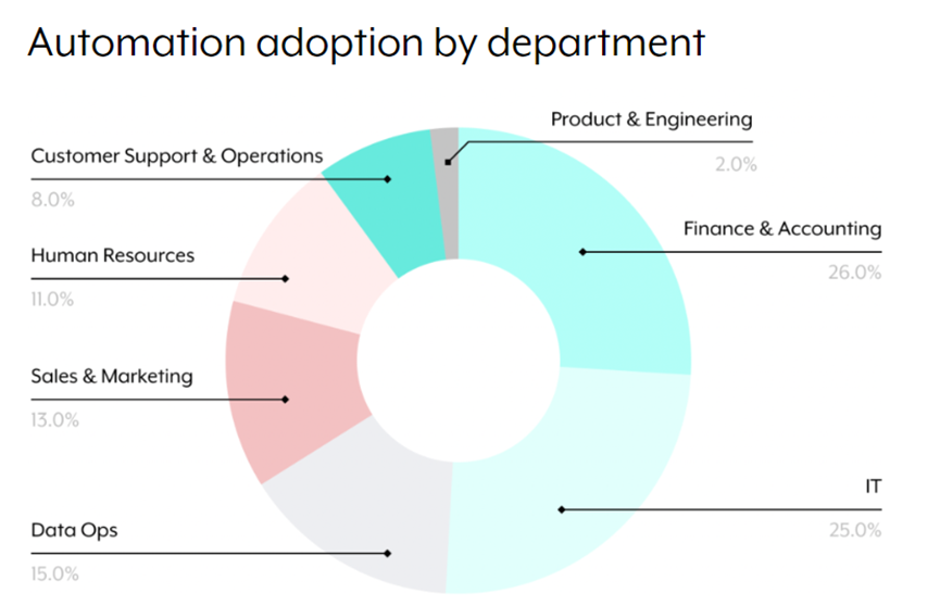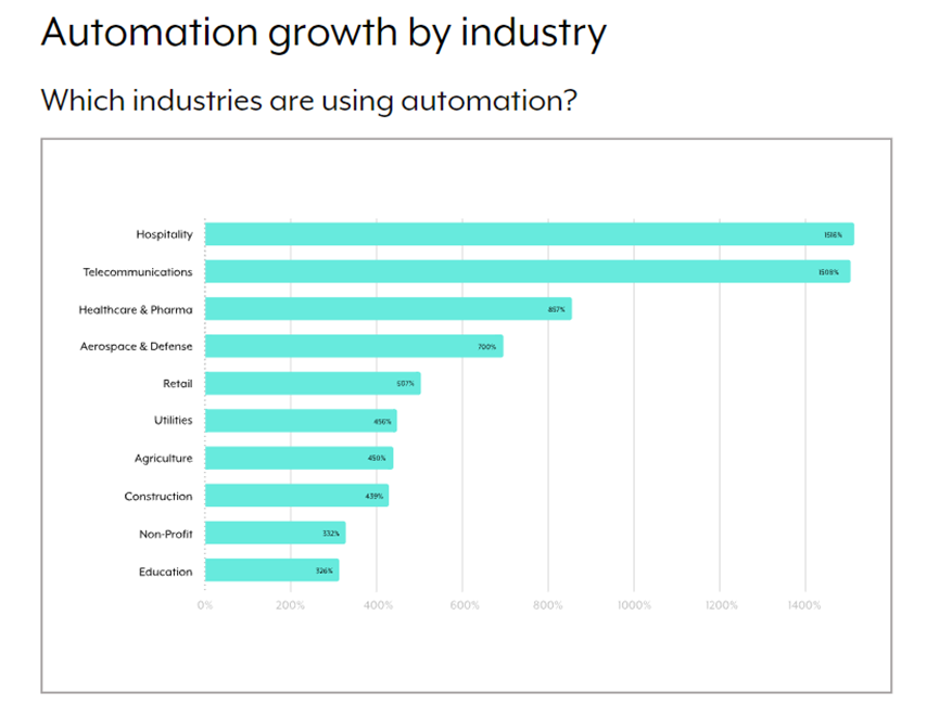自2020年以来,组织对自动化的应用呈爆炸式增长:商业智能自动化增长了1074%,客户支持增长了666%,金融增长了659%等。