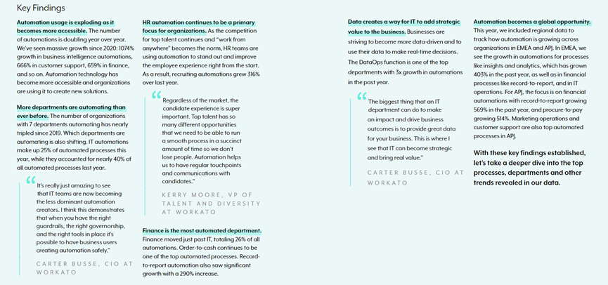 全球知名智能RPA厂商Workato连续第二年发布了《2022年业务自动化指数报告》。Workato通过对900名年收入在5000万——20亿美元的深度自动化(RPA、IPA等)企业用户进行了深度调查。