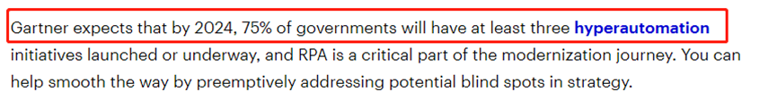 尽管RPA因其简单性而广受欢迎,但企业一直在努力扩展实施。Gartner预测,到2024年,75%的政府将启动或实施至少三项超自动化计划,从长远来看,RPA的增长将使用超自动化加速。