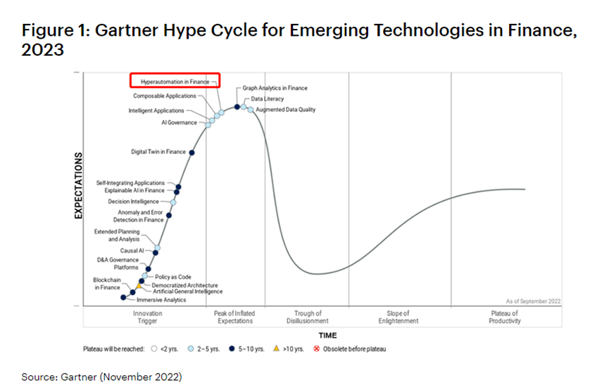 Gartner近期发布的「2023金融新兴技术成熟度曲线图」报告显示,超自动化技术已经进入顶峰期,是未来2—5年金融领域应用创新、频率、成熟度最高技术之一。显然,RPA的渗透率将会在未几年实现更高的行业渗透率。