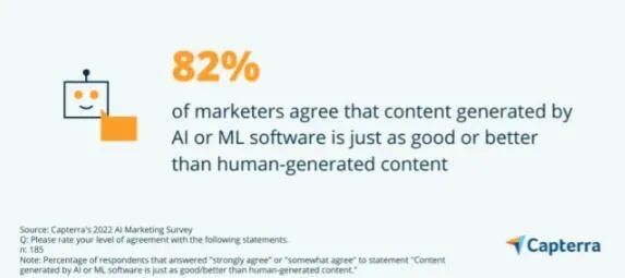 单是在销售领域,Capterra 2022年的相关调查数据显示:82% 的营销人员表示,AI 或 ML 软件生成的内容与人工生成的内容一样好(或更好);88%的营销人员发现AI或ML软件可以节省公司的时间和金钱。