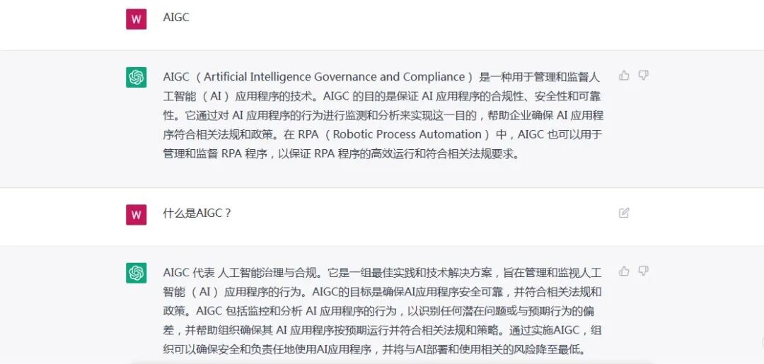 我们在初次问chatGPT「什么是AIGC」时,它并没有给出「人工智能生成内容」的答案,而是生成了「AIGC人工智能治理与合规(Artificial Intelligence Governance and Compliance)」。