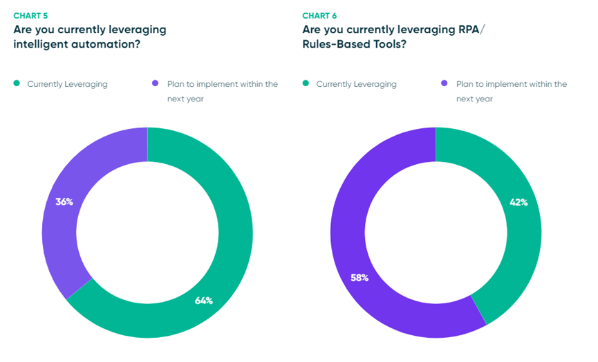 智能RPA的应用率直线上升是发生并购案的主要原因之一。数据显示,64%受访者正在使用智能自动化,36%计划在2023年实施;42%受访者正在使用RPA工具,58%受访者表示2023年将实施。