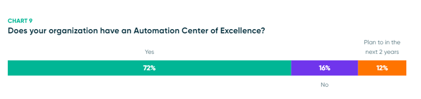自动化卓越中心(CoE)建设方面,2021年只有54%受访者实施了自动化卓越中心,而2022年已有72%受访者已经实施了自动化卓越中心。这说明,组织已经知道自动化卓越中心在自动化扩展、维护等方面的重要性。
