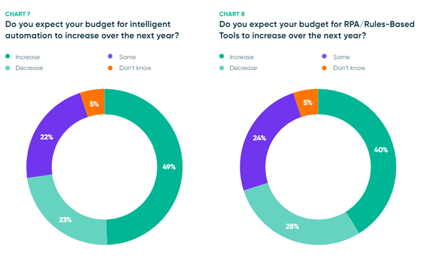 在智能自动化和RPA投资方面,49%的受访者表示将增加对只能自动化的投资;40%的将增加对RPA的投资。22%和24%的表示,将保持同样的投资预算。总体而言,组织对智能自动化和RPA的投资仍保持热情。