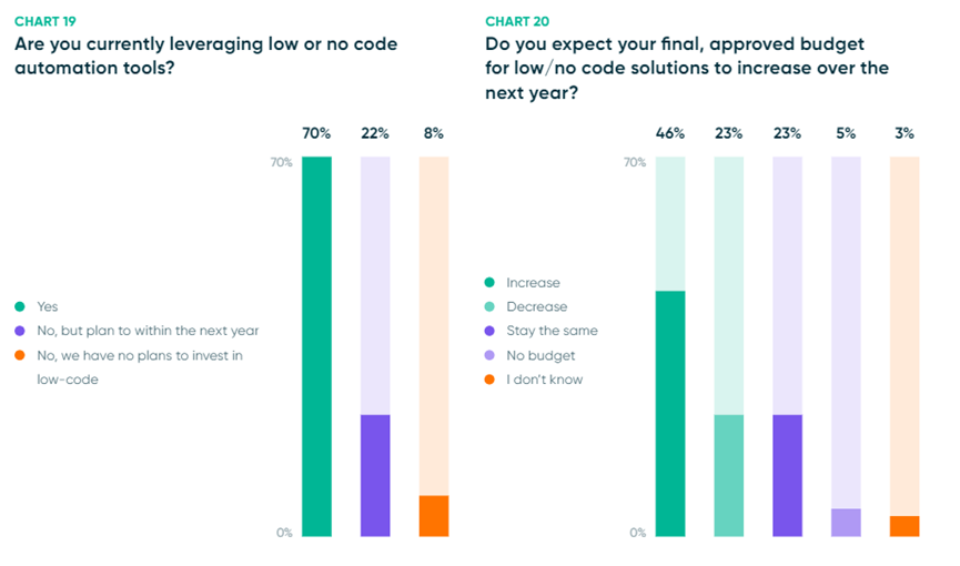 自2021年Intelligent Automation首次进行低代码、无代码自动化调查以来,这些解决方案的市场获得了快速增长。2021年只有38%的受访者在使用这些工具,而2022年有70%受访者正在使用。
