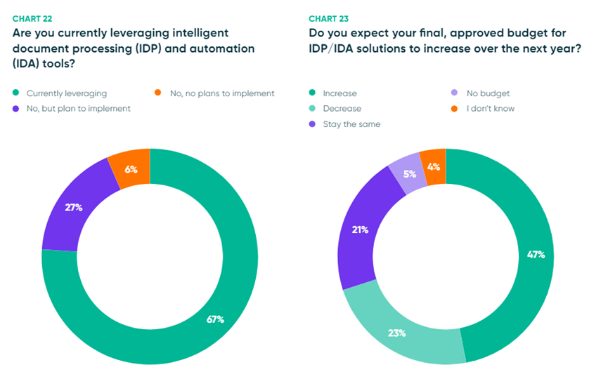 调查数据显示,67%的受访者正在使用IDP自动化工具;47%受访者将在2023年增加对IDP的投资。
