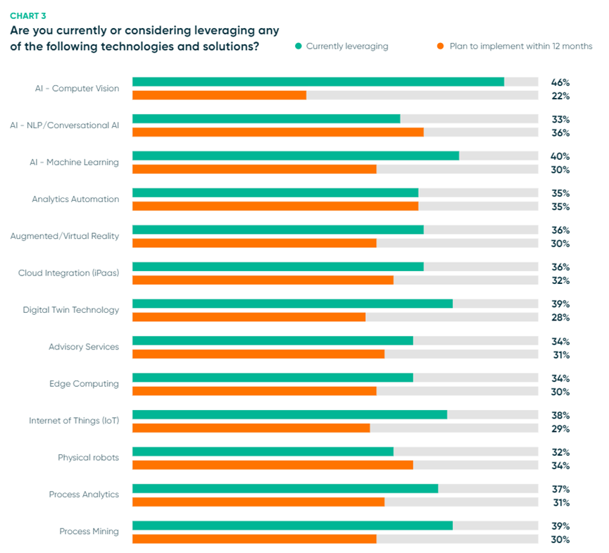 在数字化转型技术应用方面,除了智能自动化之外,流程挖掘、计算机视觉、流程分析、机器学习、AI等技术受到了广泛欢迎。