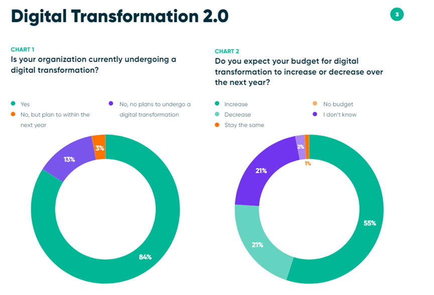 全球动荡的经济环境,使得组织对数字化转型的决心倍增。调查数据显示,84%的受访者确认他们已经在投资数字化转型,另有13%的受访者表示他们计划在2023年投资。几乎所有受访人员都认可,数字化转型是组织必须要做的事情。此外,55%的受访者表示2023年将继续增加数字化转型的投资预算。