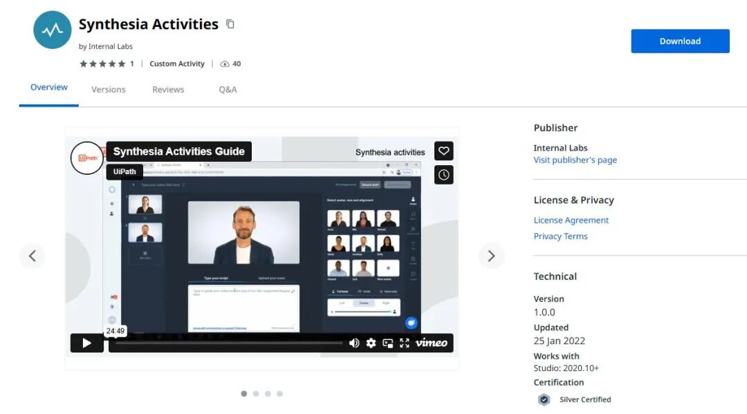为了应对当前视频消费增长的趋势,UiPath于2020年在其应用市场推出了集成Synthesia(一个生成式AI视频工具,允许创建基于AI的基于文本的视频)的插件Synthesia Activities,并为“获取视频”活动提供了自定义输出变量,以便于用户访问。