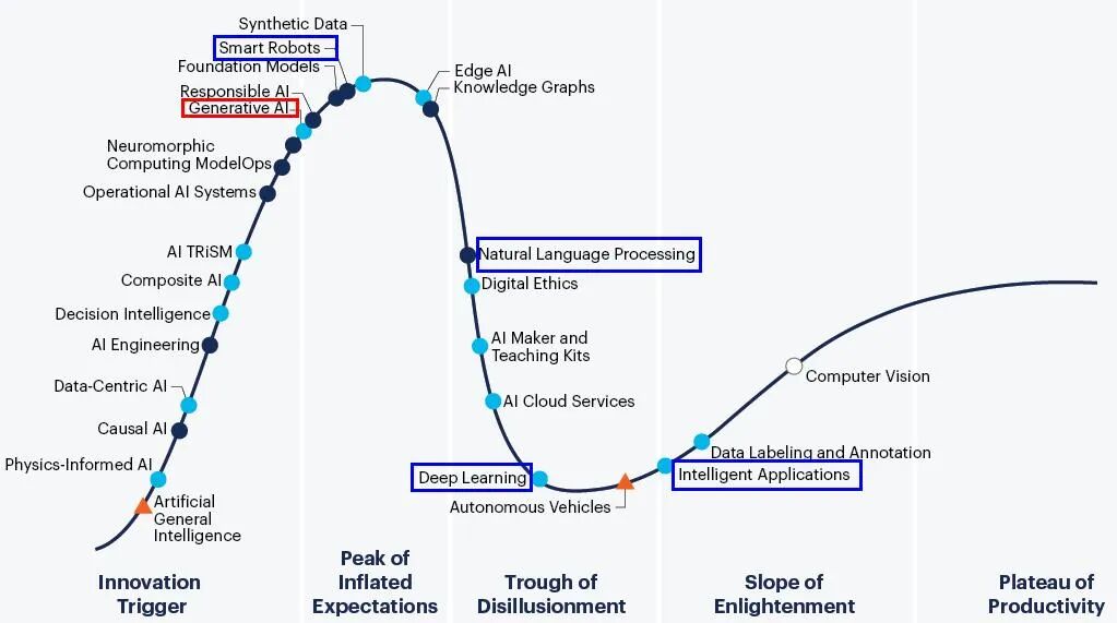 下图是2022年人工智能技术成熟度曲线。我们可以看到,生成式AI已经进入曲线的第二阶段期望膨胀期,距离生产成熟期需要的时间是2-5年。
