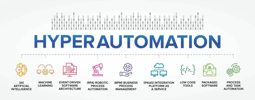 等到这几年超自动化(Hyerautomation)横空出世以后,很多厂商尤其是RPA厂商都引入了超自动化架构。超自动化是一个技术合集,用于为企业提供端到端的自动化服务。