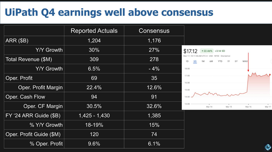 其中,UiPath作为RPA领域的领导者成为最大受益者之一。根据其最新财报显示,第四季度收入3亿美元,同比增长 7%;净新增ARR 9380万美元;基于美元的净保留率为123%。股价也实现大幅度增长,整体表现超出华尔街预期。