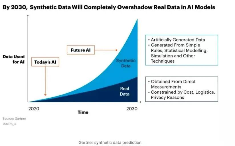 目前广大厂商已经在布局这一领域,合成数据数量也正在以指数级的速度向上增长。Gartner数据显示,2030年合成数据将远超真实数据体量,成为AI数据的主力军。