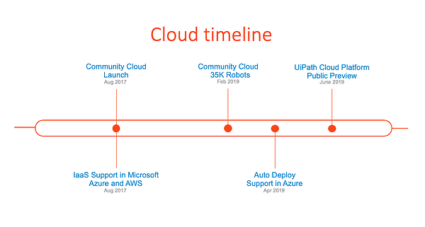 2017年,UiPath就发布了社区云产品,目前已经拥有超过17000个租户。2019年2月,社区云产品已经成功管理着35000多台机器人。同时,2017年,UiPath还在AWS以及微软Azure等领先公有云平台中启动了对基础设施即服务部署的支持,让金融服务与政府机构在内的众多大客户,都能通过公有云进行业务部署。