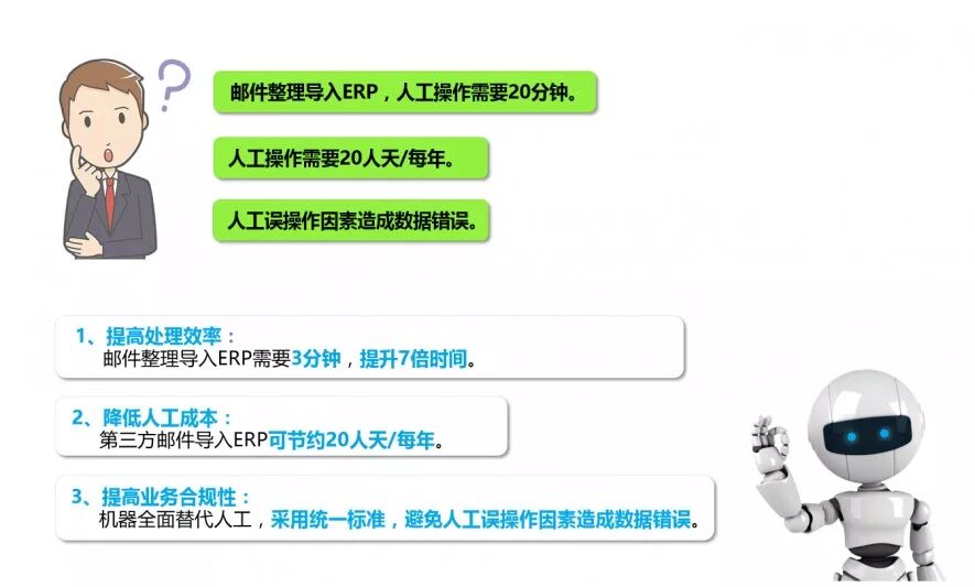 引入金智维RPA机器人后,统一由员工的手工操作改为由机器人操作。RPA机器人自动登录邮箱,将相关交易流水汇总,并根据相关模板格式进行自动转换,自动导入到ERP系统进行记账处理。