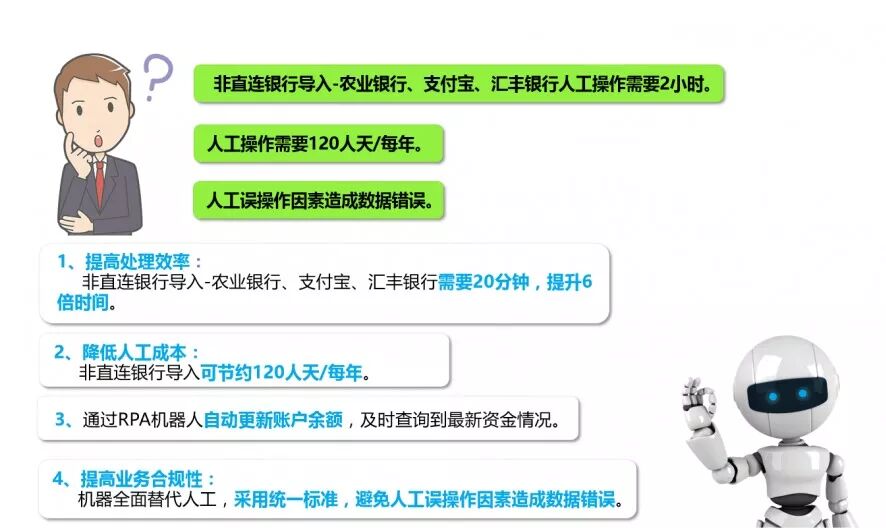 涉及的网银数量多,且需要来回切换网银系统,汇总相关的数据,人工处理效率低。存在不及时导入,导致资金情况无法及时监控。