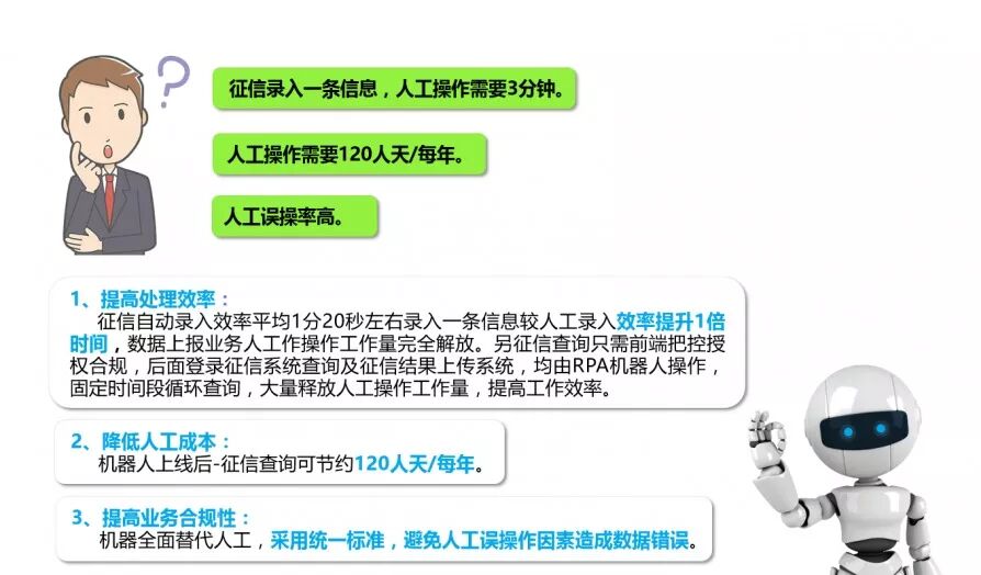 征信管理系统共分两部分,征信信用信息查询和业务数据上报,为了保证业务合规及效率两项工作由专人负责,每日业务量大,均需人工操作。工作内容整体相比人工效率低,工作内容每日重复,操作机械化无升值空间。