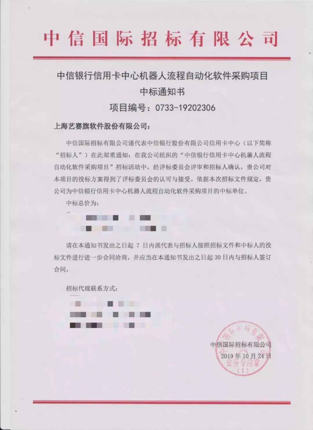 继9月成功中标广发银行的RPA产品项目以来,近期艺赛旗捷报频传、再创佳绩!近日又成功赢得了“中信银行信用卡中心机器人流程自动化软件”项目的中标结果,恭喜艺赛旗成功中标!
