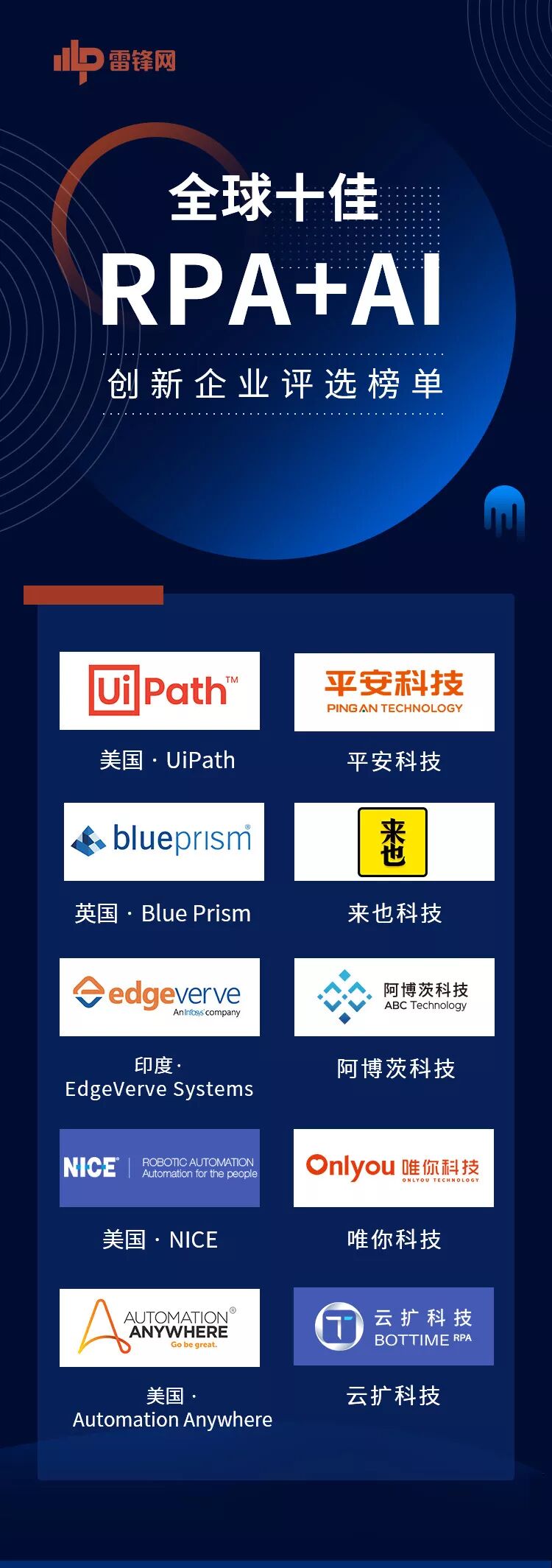 今天,雷锋网全球十佳“RPA+AI”创新企业榜单正式揭晓: