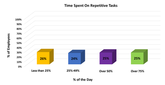 根据调查报告,50%的员工会把超过一半以上的工作时间花在重复性任务上。很多企业组织开始有意识地利用大数据为客户带来个性化客户体验,需要员工围绕着覆盖全渠道的服务数据处理工作。乏味的数据背后涉及着大量的重复性工作,在满足客户优良体验的背后,是员工工作体验和工作时间的牺牲浪费。
