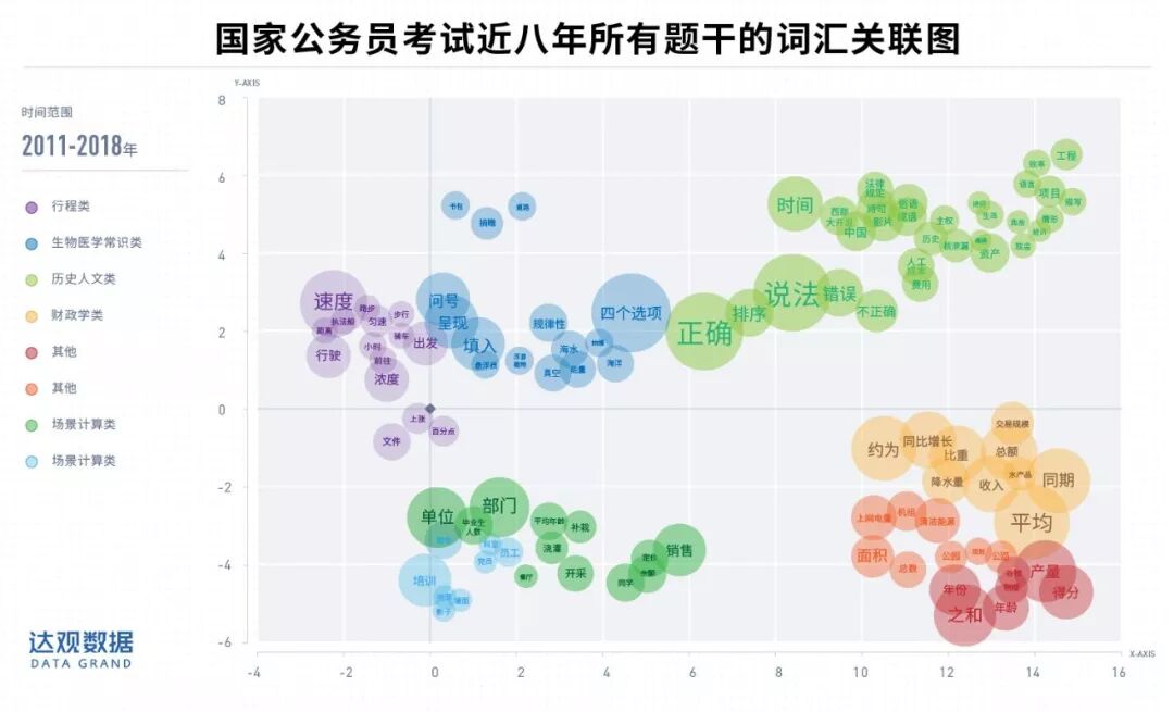虽然笔者没参加过国家公务员考试(以下简称“国考”),但本着“内行看门道,外行看热闹”的心态,笔者想一个旁观者的视角,通过一些语义分析技术去发现近八年(2011~2018)国考行政职业能力测验(以下简称“行测”)考了哪些内容,看能否有一些规律性的发现。