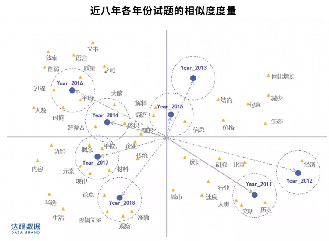 对应分析法可以揭示同一变量的各个类别之间的差异,以及不同变量各个类别之间的对应关系。比如不同年份的试题是不同类别,关键词汇是变量。对应分析图谱可以将这8年的试题相关度情况通过视觉上可以接受的定位图展现出来。