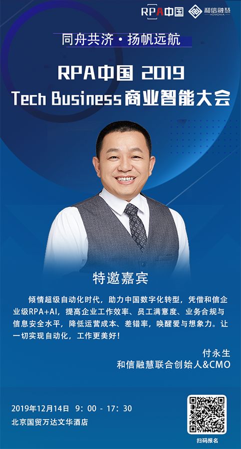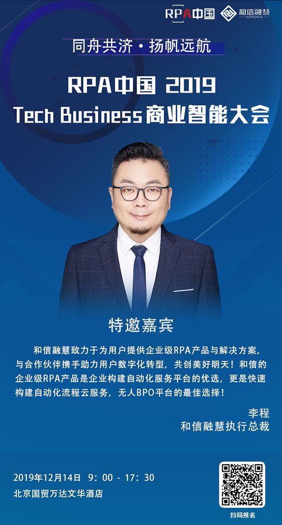 中国RPA行业资深老兵--和信融慧(北京和信融慧信息科技有限公司)将受邀出席,由RPA中国于12月14日在北京举办的“RPA中国2019 Tech Business商业智能大会”。通过此次大会,和信融慧将与在场数百位观众和嘉宾分享和信融慧4年多来对RPA行业的深刻见解与技术创新。