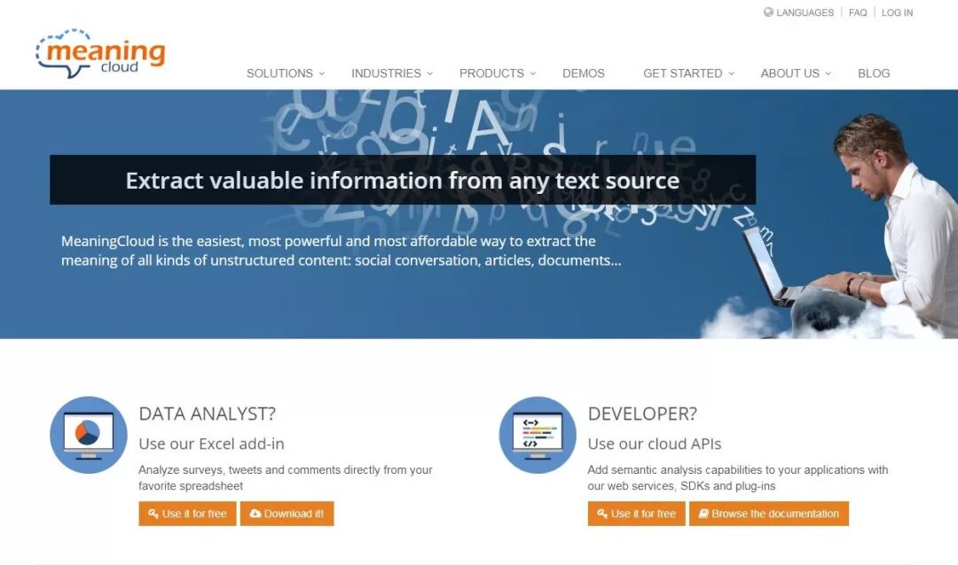 情感分析:Meaning Cloud结合了最先进的人工智能技术,提供功能级别的情感分析,社交媒体语言处理。