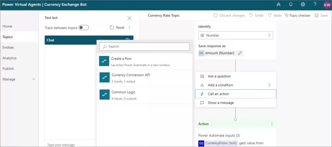 此外,Power mate等其他Power Platform服务可与Power Virtual Agent协同工作。在Power VirtualAgents中,有一个“调用动作”功能,使用户可以创建新的Power Automate流程或调用现有的Power Automate流程。通过调用流程,用户可以访问290多个SaaS和本地连接器,这些连接器可以检索丰富的自动化机器人列表。