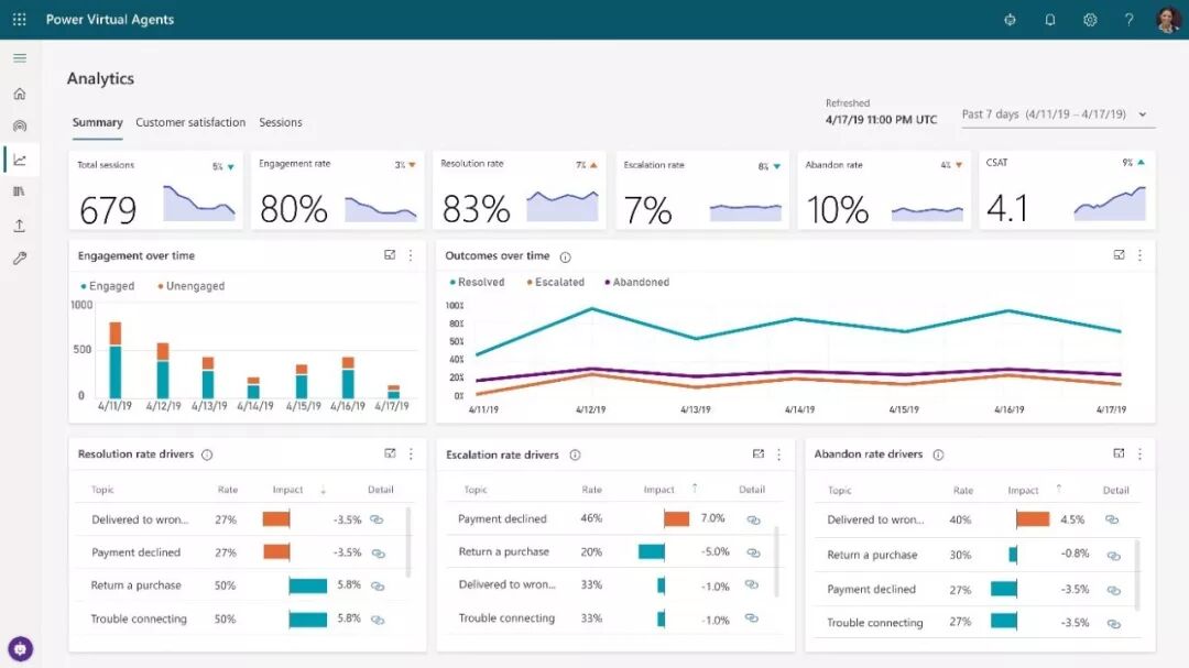 Power Virtual Agents的另外一个核心功能是内置分析功能。通过此功能,用户可以直观的看到所有客户的咨询对话、满意率、回答准确率等,以便更好地了解客户满意度评分(CSAT),并确定需要改进的地方。同时这也有助于用户决定在何时加入人工服务,帮助用户解决聊天机器人无法解决的问题。
