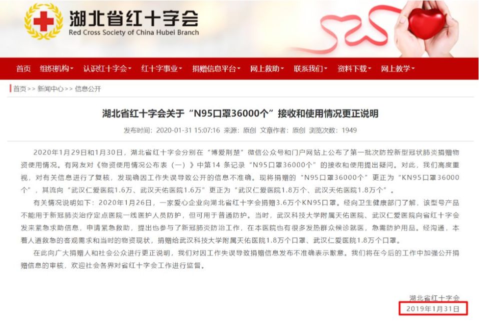 在这条更正说明发出后不久,许多细心的网友发现,湖北省红十字会的说明落款时间写着“2019年1月31日”。