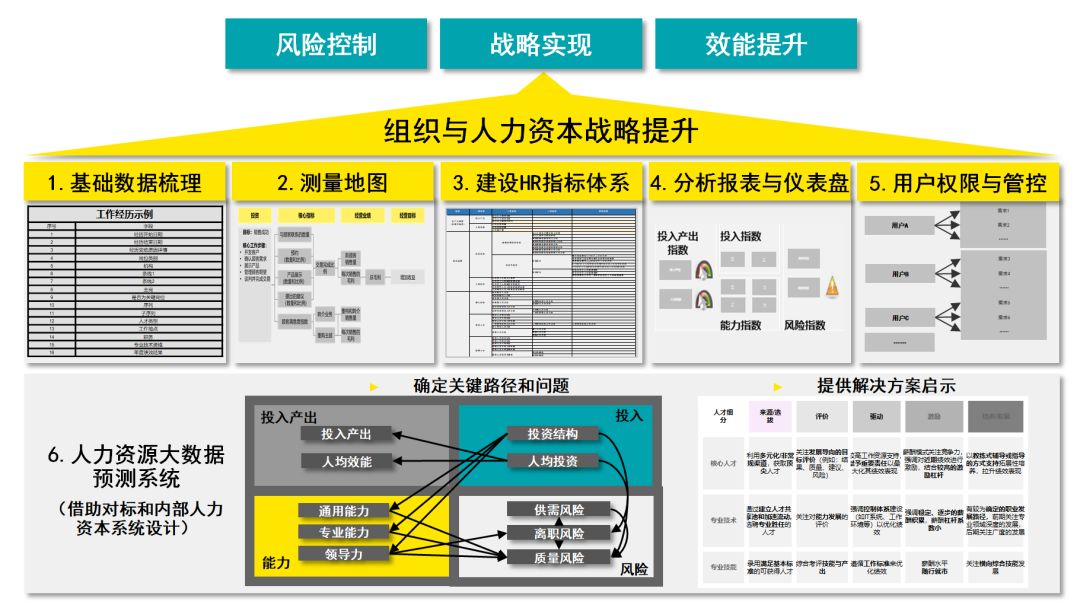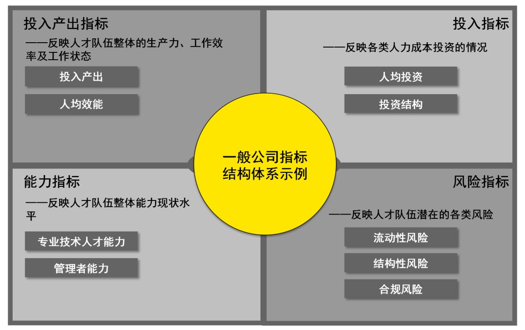 建立系统、有机的人力资源指标体系,通过完善的人力资源四个维度,包括投入产出类、投入类、能力类和风险类四个层面,并借助第一个模块梳理的关键业绩维度,对非结构化数据进行指标及数据结构化,并依托对“核心人员画像”的底层数据梳理、规范化、编码,构建更完备的数据基础,进而形成一家企业的完备、系统、有机的人力资源指标体系;此外,如果历史数据完整,可以对相应问题树上的测量地图进行相关性分析,进而了解相应指标效度,有利于精简、完善指标体系;