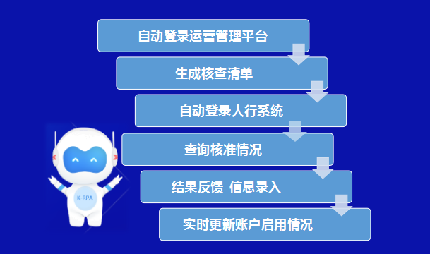 RPA能够自动在自动化报送单位账户信息基础上,自动更新核准结果,并自动将账户启用。提升账户处理时效,强化人行、总行、网点业务沟能。